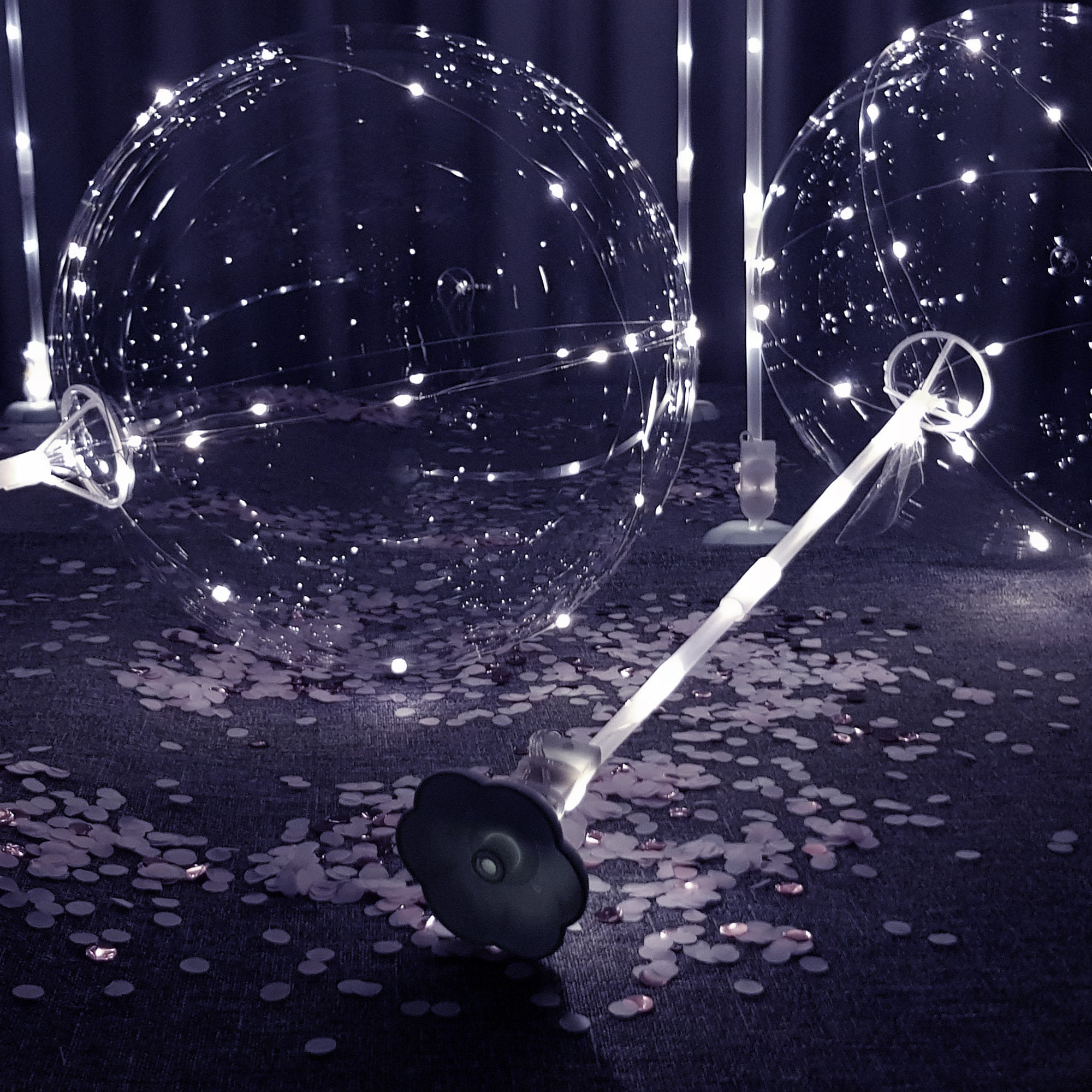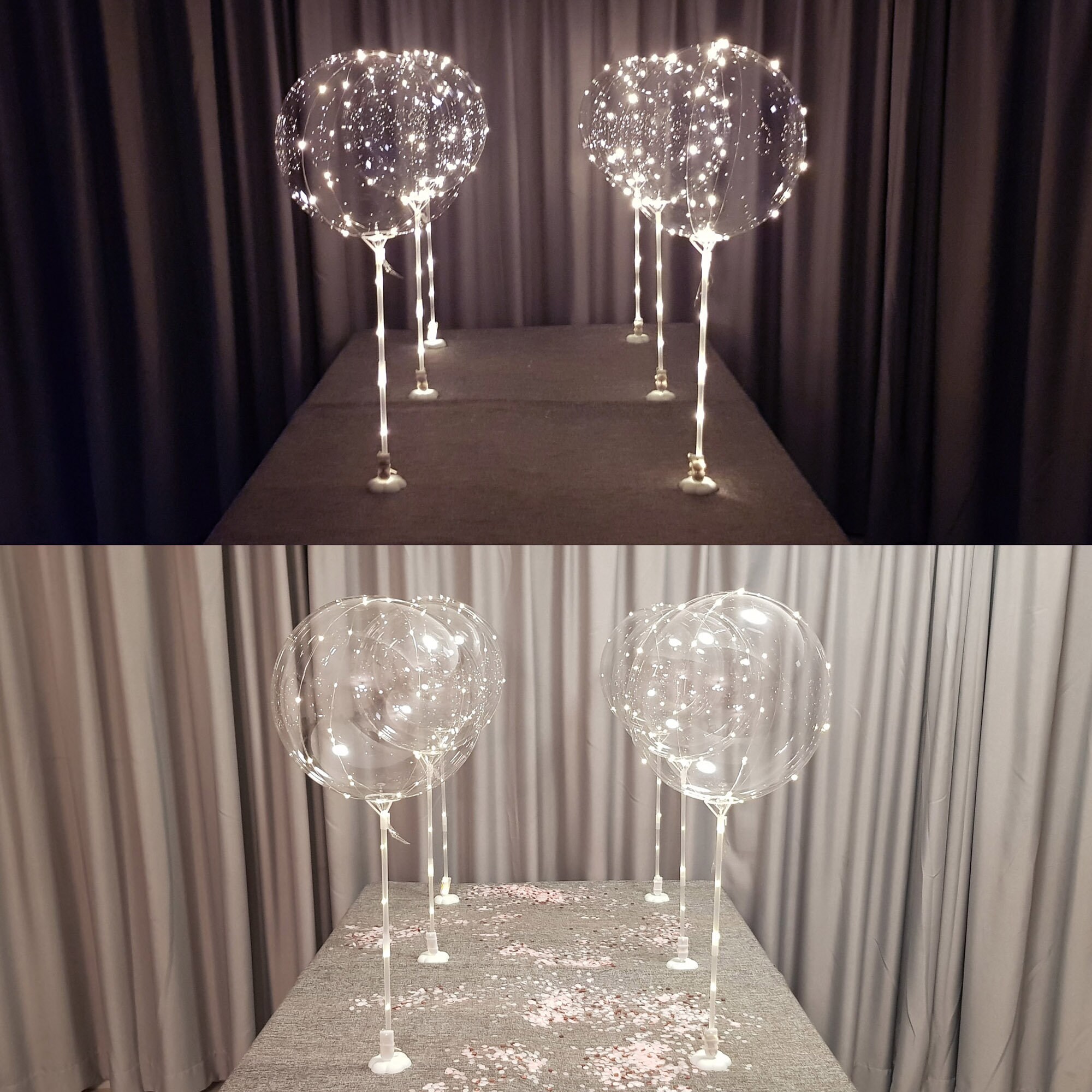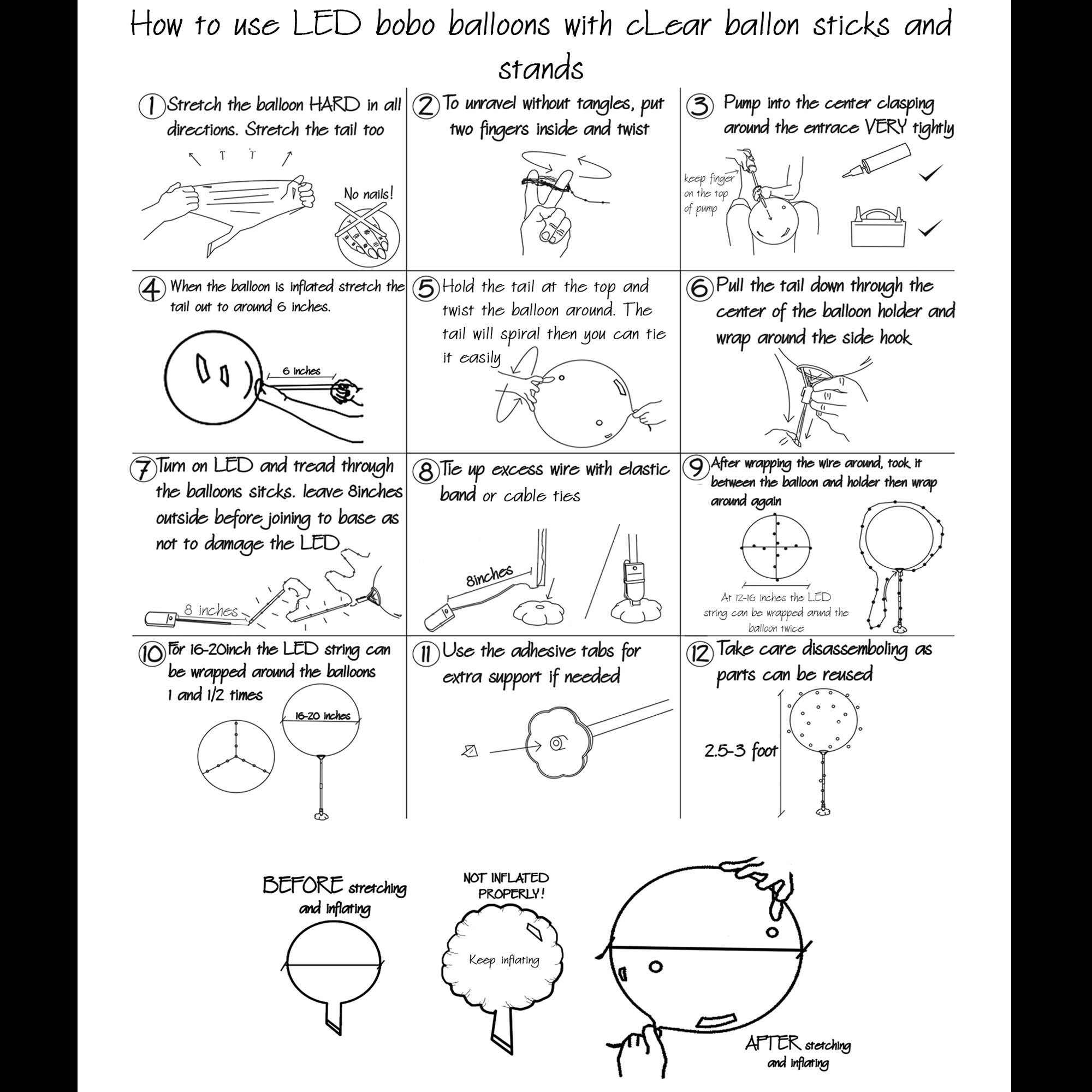 All you need is a decent pump, preferably an air compressed pump and your ready to go. The product was designed specifically for dining table decor and as a more cost effective, convenient alternative to helium balloons. The balloons are 12-20 inch and are quite secure when assembled and stuck.The length from the bottom to the top when assembled is about 32 inches. The LED strip lights are constant. This balloons will stick directly on a table however they won't work on a table cloth as the cloth has no resistance. If you intent to use a table cloth you will need to stick them to beer mats or small plates or some other fixed surface.