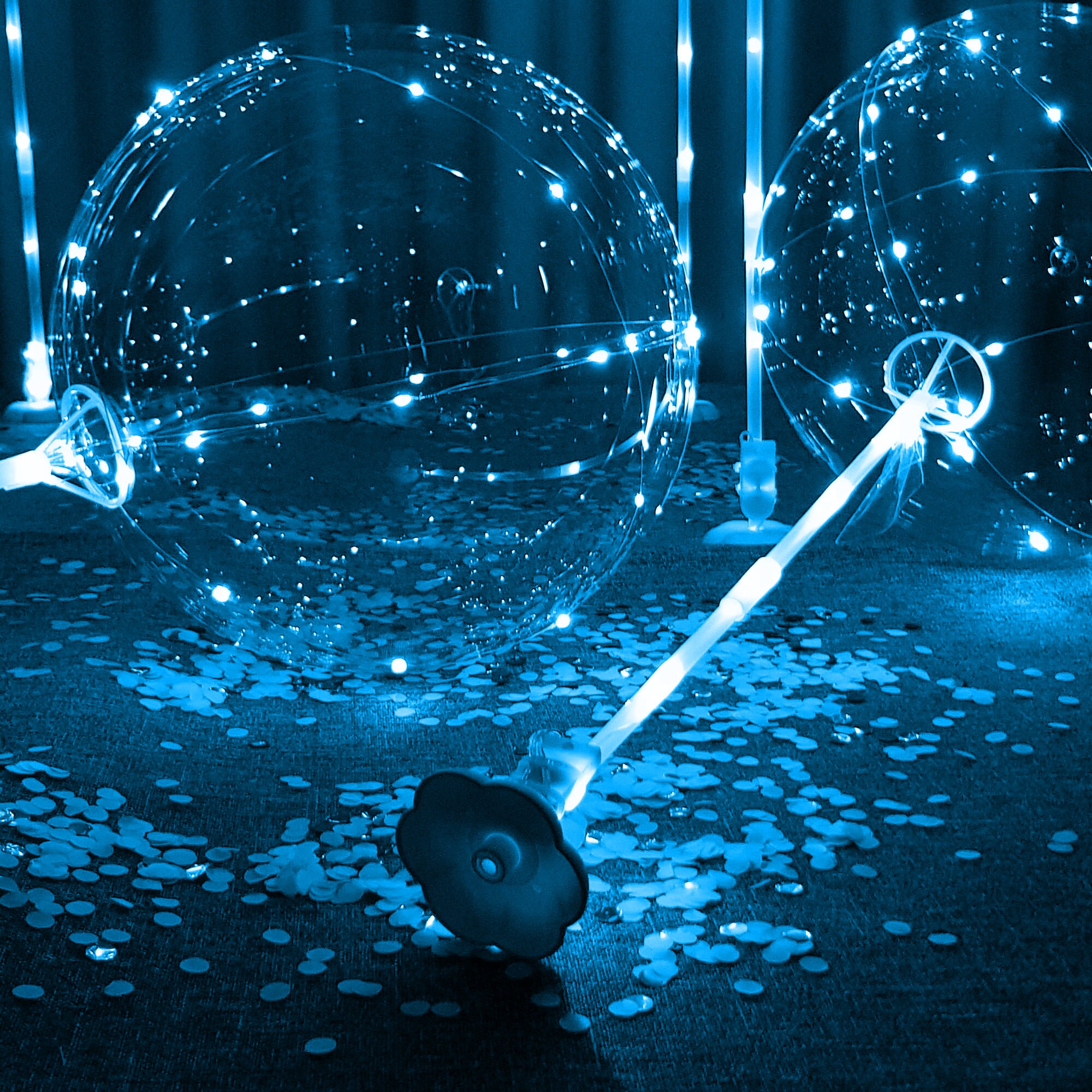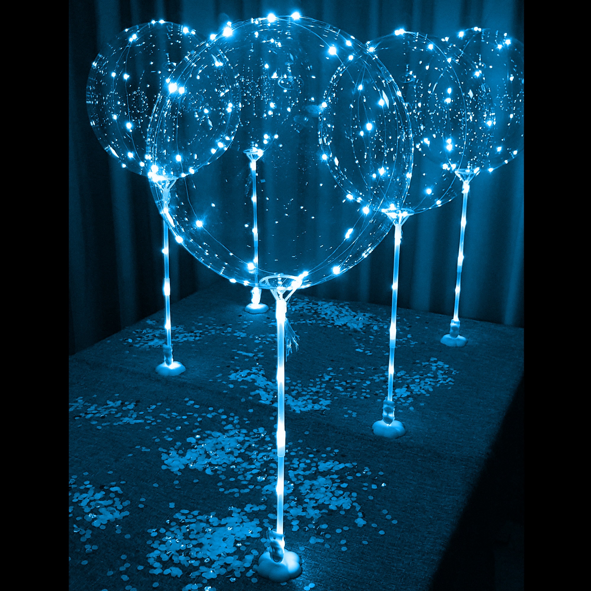 All you need is a decent pump and you're ready to go. The product was designed specifically for dining table decor and as a more cost effective, convenient alternative to helium balloons. The balloons are 12-18 inch and are quite secure when assembled and stuck. The length from the bottom to the top when assembled is about 32 inches. The LED strip lights are constant. This balloons will stick directly on a table however they won't work on a table cloth as the cloth has no resistance. If you intent to use a table cloth you will need to stick them to beer mats or small plates or some other fixed surface.