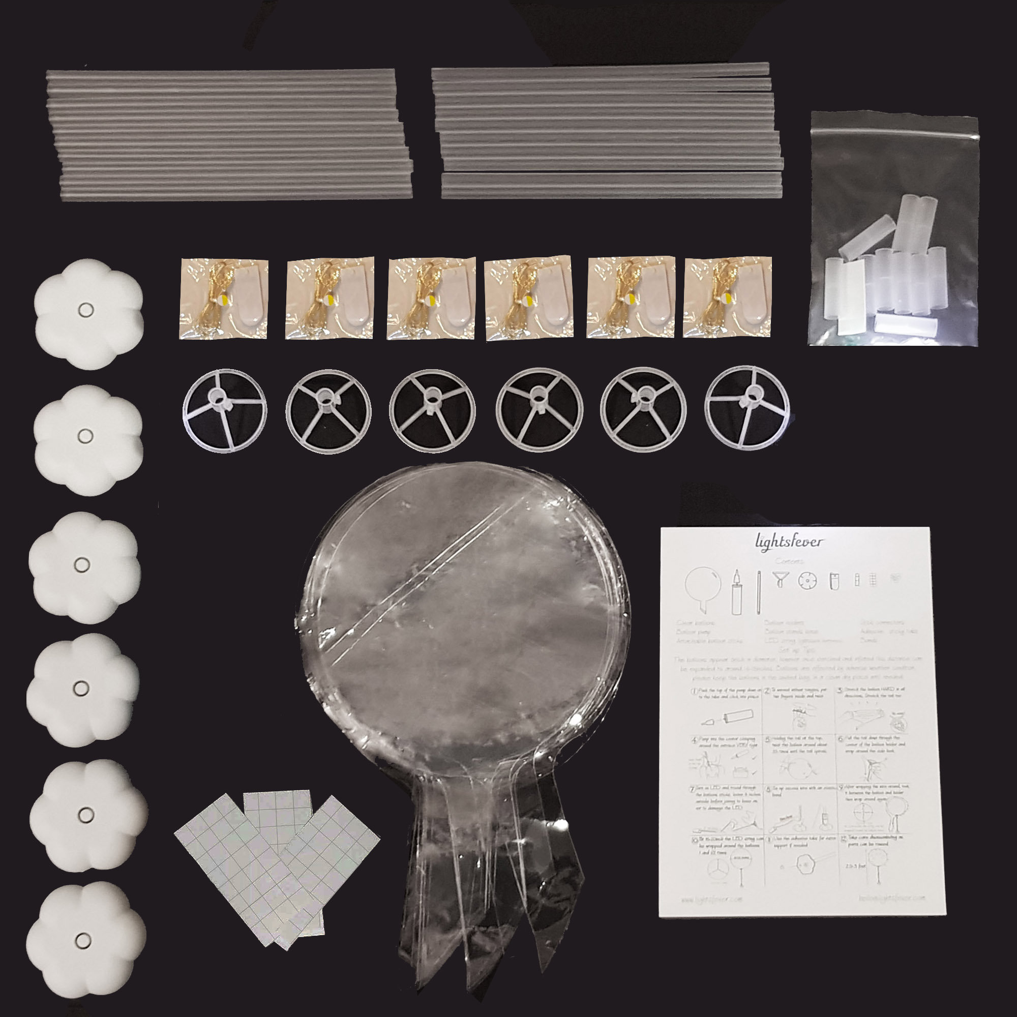 All you need is a decent pump and you're ready to go. The product was designed specifically for dining table decor and as a more cost effective, convenient alternative to helium balloons. The balloons are 12-18 inch and are quite secure when assembled and stuck. The length from the bottom to the top when assembled is about 32 inches. The LED strip lights are constant. This balloons will stick directly on a table however they won't work on a table cloth as the cloth has no resistance. If you intent to use a table cloth you will need to stick them to beer mats or small plates or some other fixed surface.