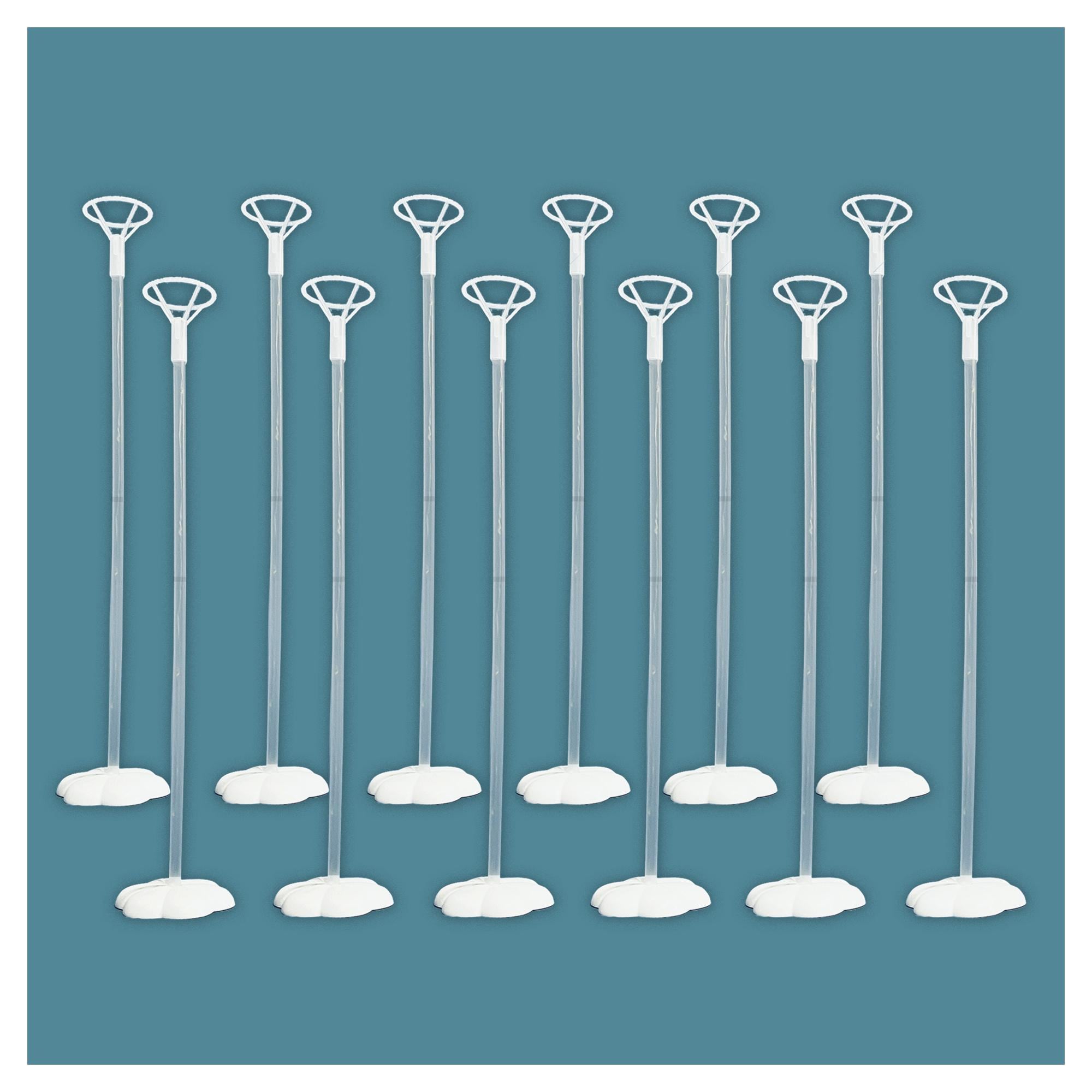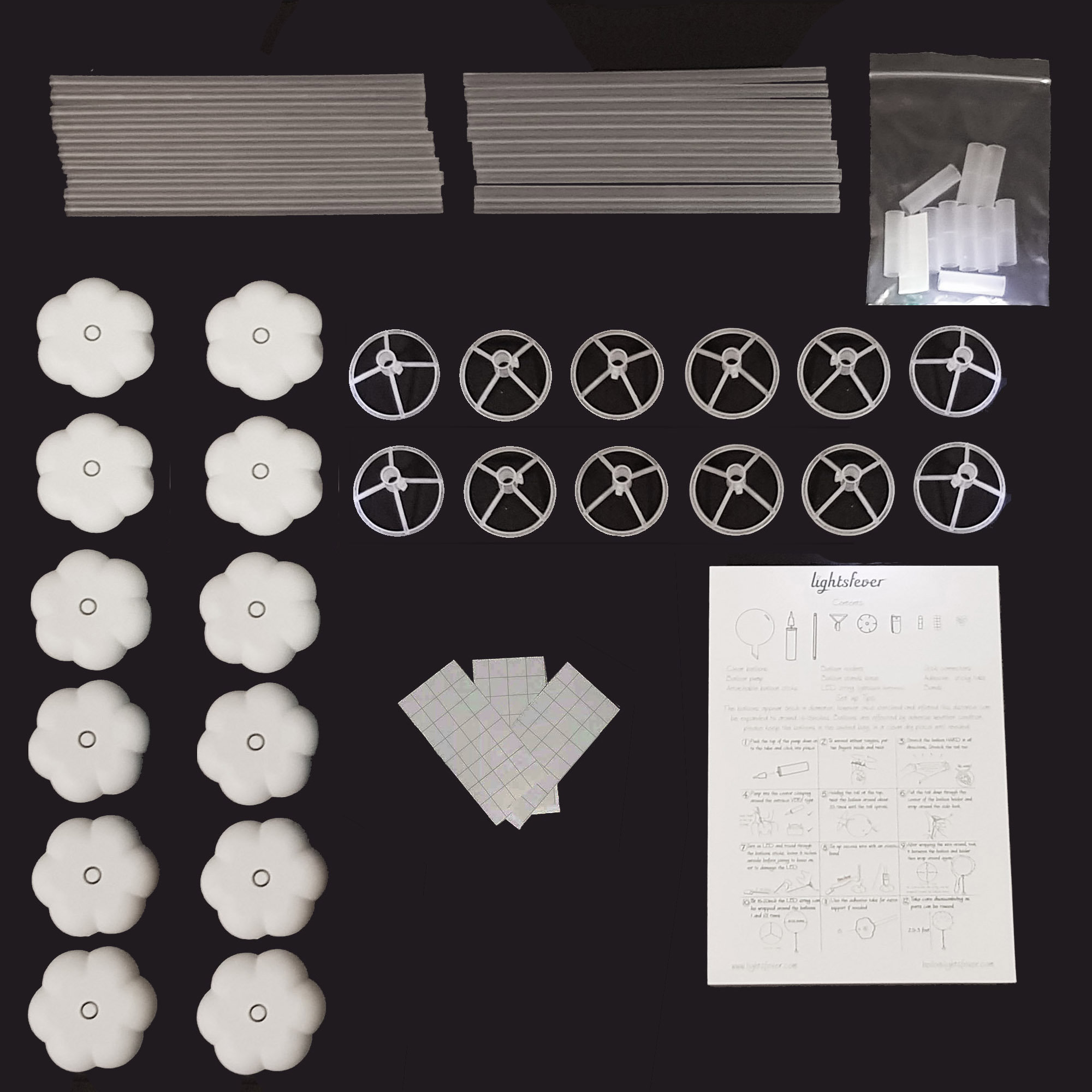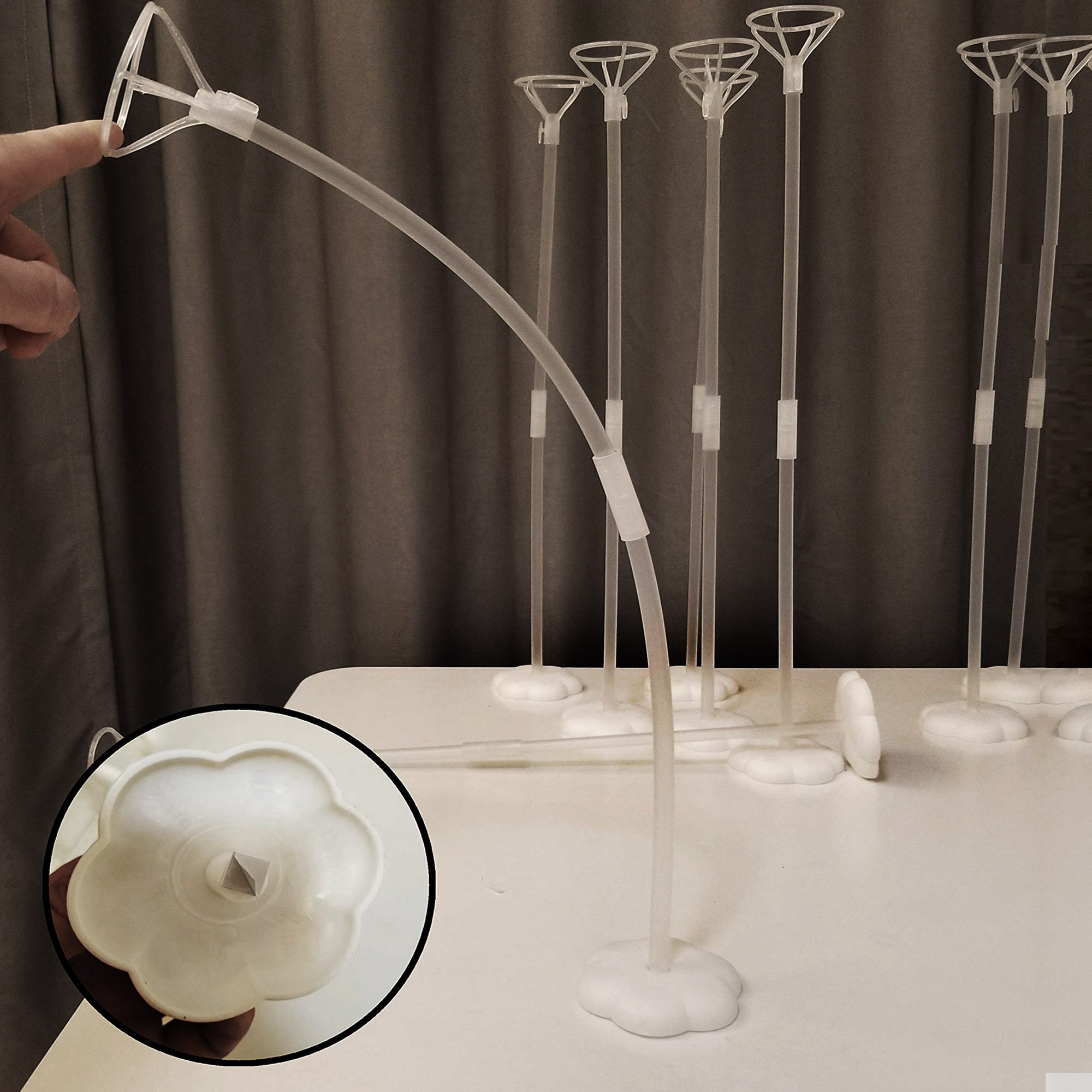12 clear balloons sticks with balloon cone holders 12 white stands to hold the balloon up 12 double sided adhesive tabs for extra support instruction booklet for assembling. This set is all transparent and is suitable to use with LED string lights and clear balloons. There are small double side adhesive stickers for securing it down after assembly. If the balloons are filled with stuff and very heavy you may add extra weight on the bottom stand part.