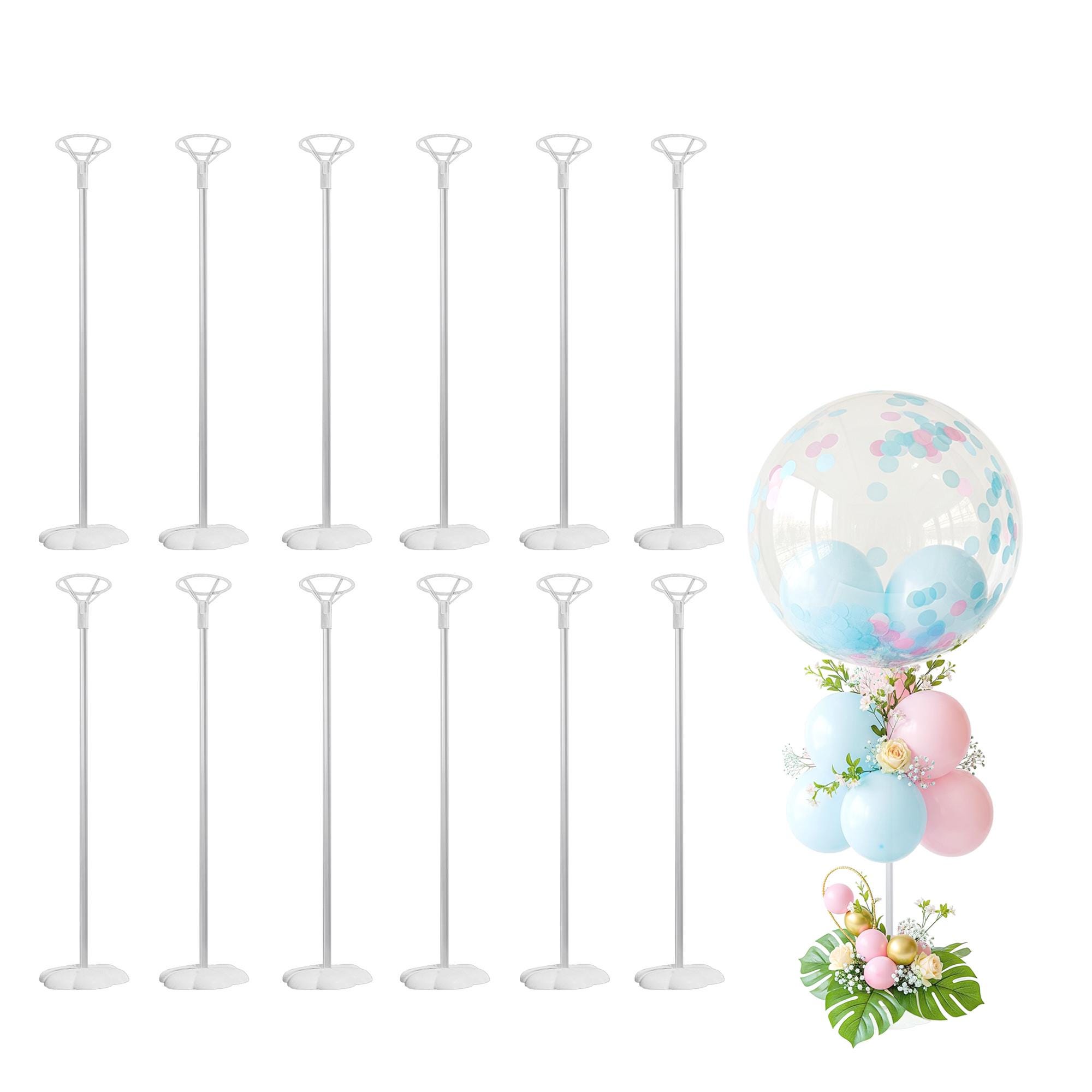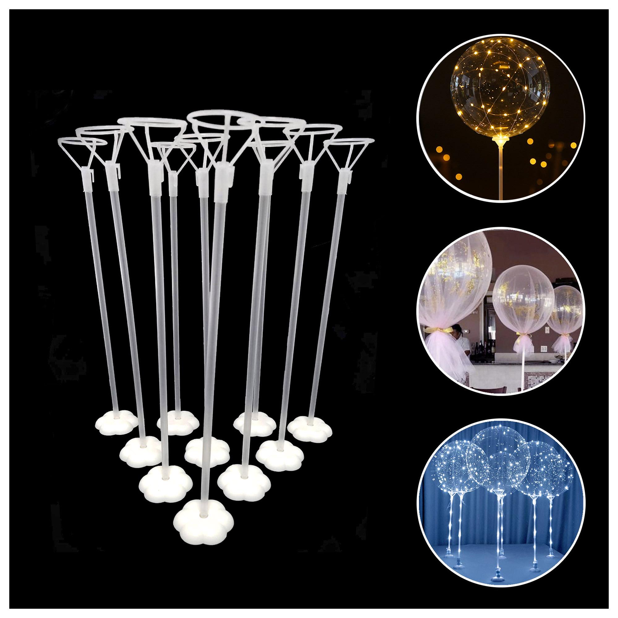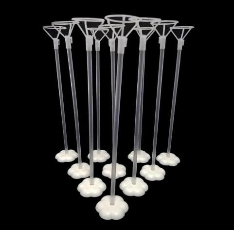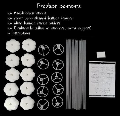 10 clear balloons sticks with balloon cone holders 10 white stands to hold the balloon up 10 double sided adhesive tabs for extra support instruction booklet for assembling.(40cm) long