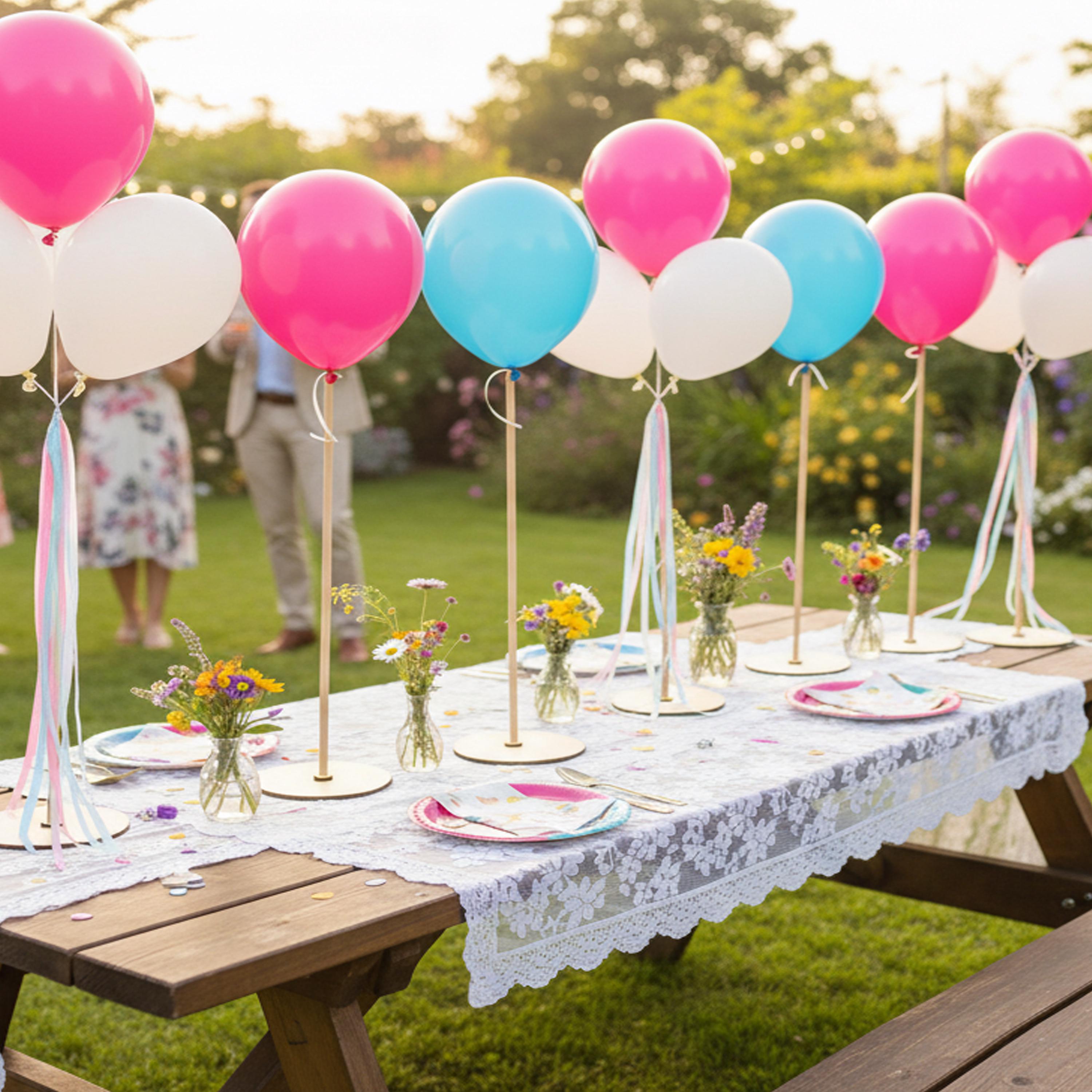 Effortless Assembly & Versatile Display: With a simple design, these balloon stands allow for quick, tool-free setup – just insert your balloon sticks into the flat wooden round bases. No helium needed, making decorating hassle-free for both indoor and outdoor use.