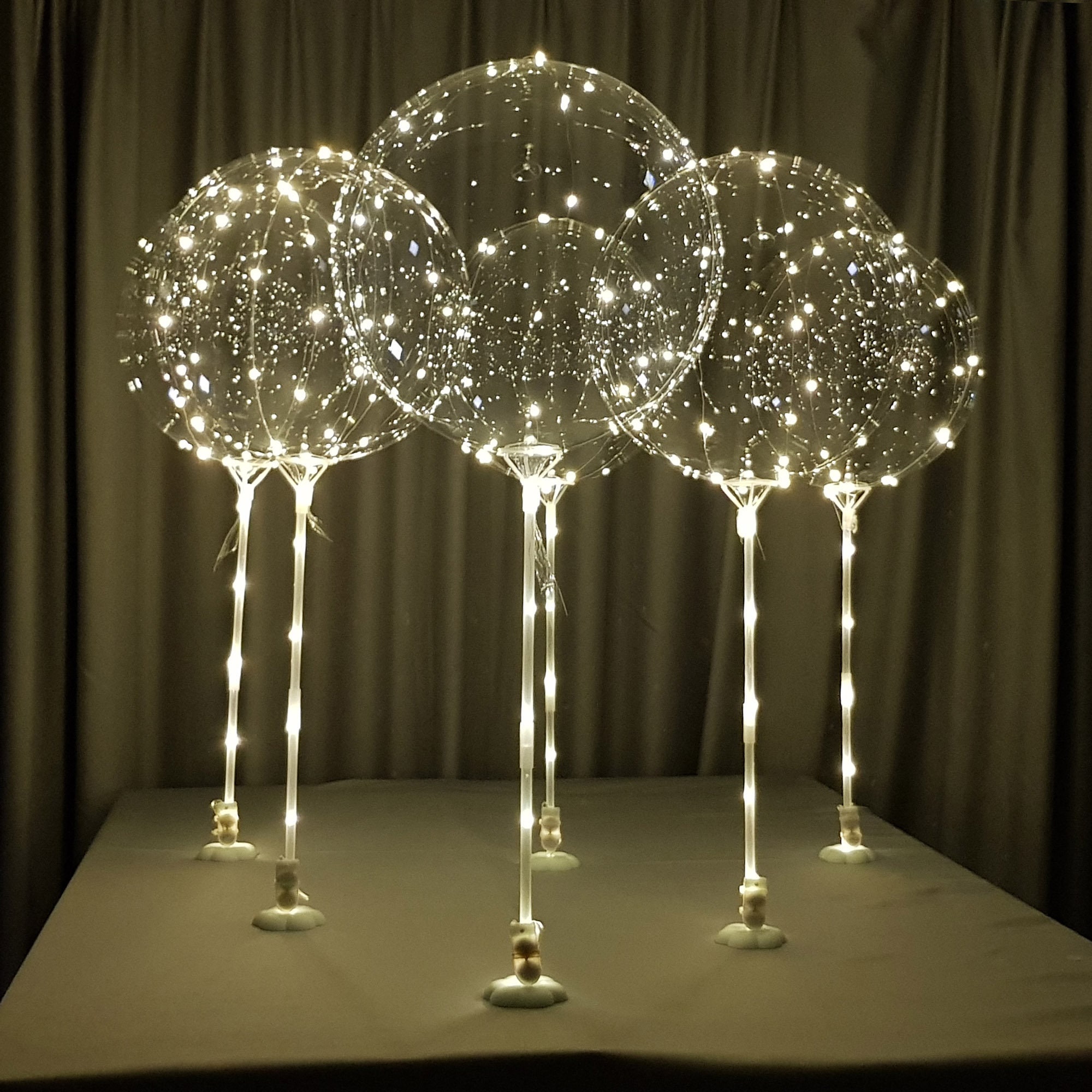 All you need is a decent pump, preferably an air compressed pump and you're ready to go. The product was designed specifically for centerpieces for party dining table décor and as a more cost effective, convenient alternative to helium balloons. The balloons are 12-18 inch and are quite secure when assembled and stuck. The length from the bottom to the top when assembled is about 32 inches. The LED strip lights are constant warm white color. This balloons will stick directly on a table however they won't work on a table cloth as the cloth has no resistance. If you intent to use a table cloth you will need to stick them to beer mats or small plates or some other fixed surface.